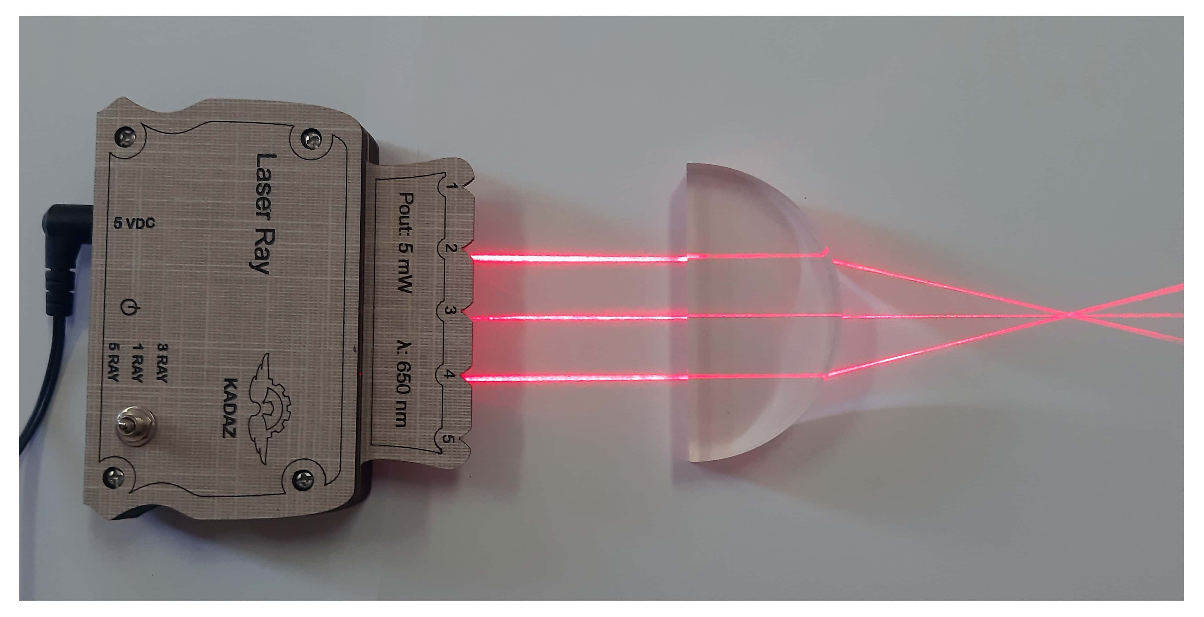 کانونی شدن سه پرتو در وسط لنزهای نیم دایره ای